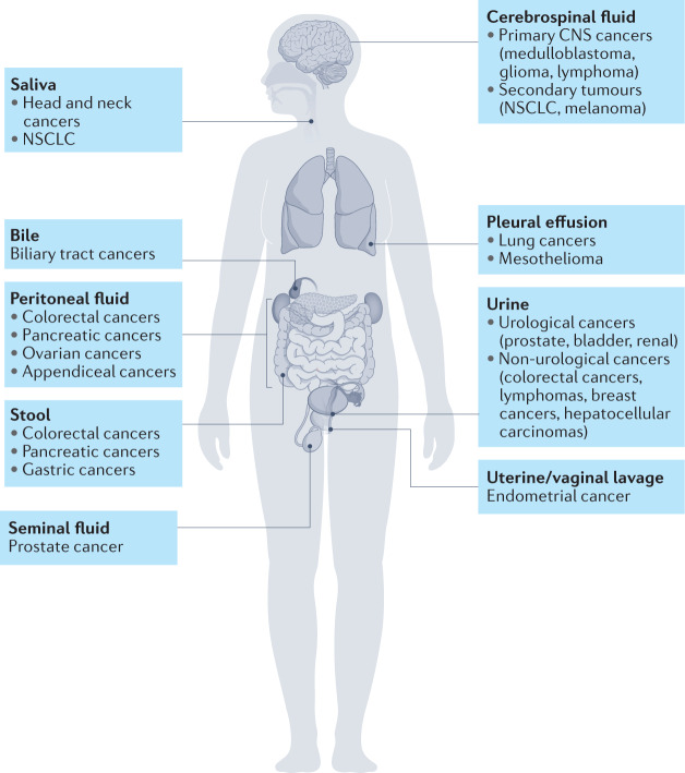 Over the past decade, various liquid biopsy techniques have emerged as viable alternatives to the analysis of traditional tissue biopsy samples. Such surrogate 'biopsies' offer numerous advantages, including the relative ease of obtaining serial samples and overcoming the issues of interpreting one or more small tissue samples that might not reflect the entire tumour burden. To date, the majority of research in the area of liquid biopsies has focused on blood-based biomarkers, predominantly using plasma-derived circulating tumour DNA (ctDNA). However, ctDNA can also be obtained from various non-blood sources and these might offer unique advantages over plasma ctDNA. In this Review, we discuss advances in the analysis of ctDNA from non-blood sources, focusing on urine, cerebrospinal fluid, and pleural or peritoneal fluid, but also consider other sources of ctDNA. We discuss how these alternative sources can have a distinct yet complementary role to that of blood ctDNA analysis and consider various technical aspects of non-blood ctDNA assay development. We also reflect on the settings in which non-blood ctDNA can offer distinct advantages over plasma ctDNA and explore some of the challenges associated with translating these alternative assays from academia into clinical use.