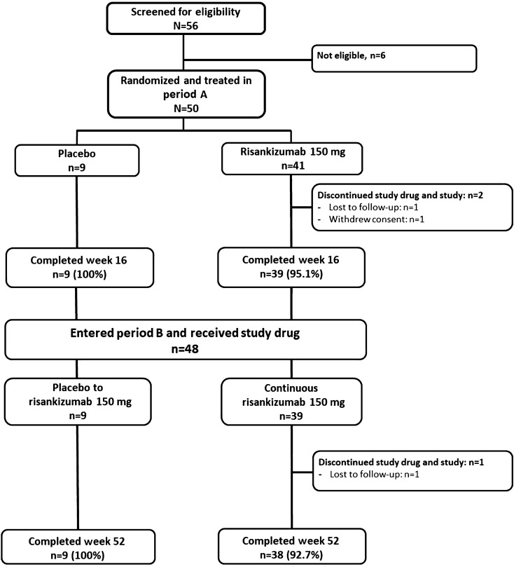 Results: Of the 50 patients who entered period A, 41 were randomized to receive risankizumab and 9 to receive placebo. Forty-eight patients entered period B, and 47 completed the study. A significantly larger proportion of risankizumab-treated patients achieved PASI 90 at week 16 compared with placebo-treated patients [response rate difference: 38.8% (95% CI 7.8-69.7%; P = 0.035)]. Consistently higher proportions of risankizumab-treated patients achieved secondary endpoints compared with the placebo-treated patients. Safety profiles were similar between the treatment groups, and no patients discontinued the study drug owing to adverse events.