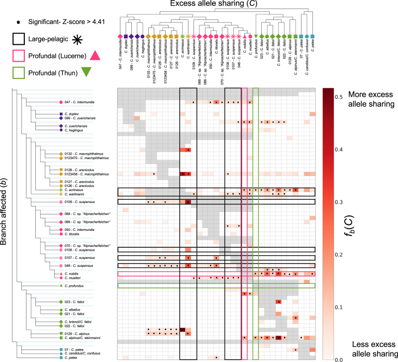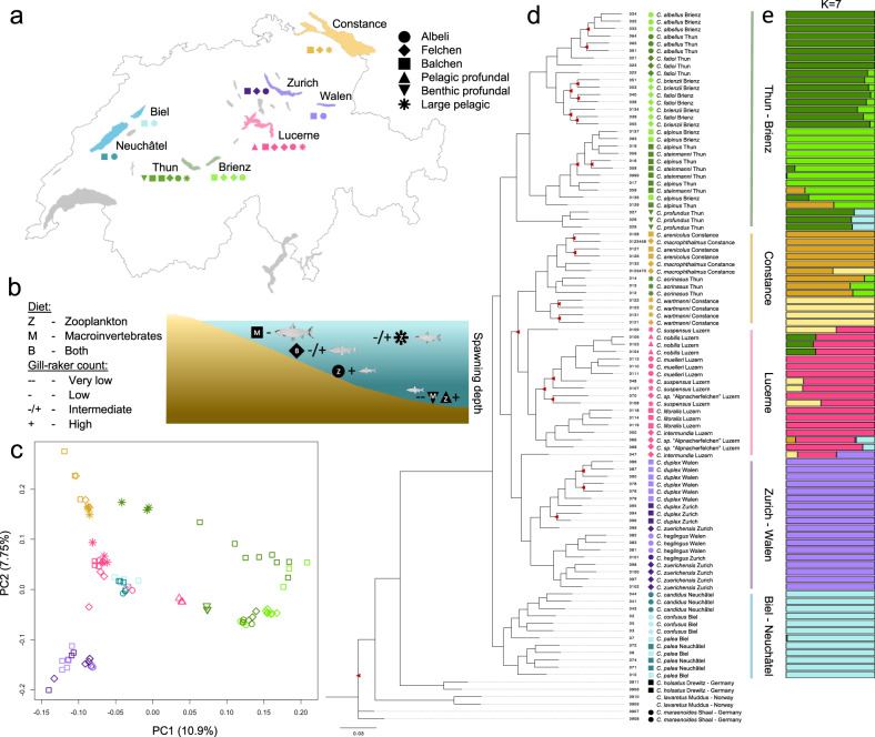 Adaptive radiations represent some of the most remarkable explosions of diversification across the tree of life. However, the constraints to rapid diversification and how they are sometimes overcome, particularly the relative roles of genetic architecture and hybridization, remain unclear. Here, we address these questions in the Alpine whitefish radiation, using a whole-genome dataset that includes multiple individuals of each of the 22 species belonging to six ecologically distinct ecomorph classes across several lake-systems. We reveal that repeated ecological and morphological diversification along a common environmental axis is associated with both genome-wide allele frequency shifts and a specific, larger effect, locus, associated with the gene edar. Additionally, we highlight the possible role of introgression between species from different lake-systems in facilitating the evolution and persistence of species with unique trait combinations and ecology. These results highlight the importance of both genome architecture and secondary contact with hybridization in fuelling adaptive radiation.