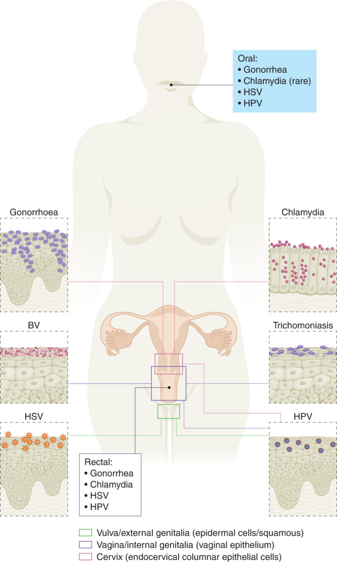 Women are disproportionately affected by sexually transmitted infections (STIs) throughout life. In addition to their high prevalence in women, STIs have debilitating effects on female reproductive health due to female urogenital anatomy, socio-cultural and economic factors. In this Review, we discuss the prevalence and impact of non-HIV bacterial, viral and parasitic STIs on the reproductive and sexual health of cisgender women worldwide. We analyse factors affecting STI prevalence among transgender women and women in low-income settings, and describe the specific challenges and barriers to improved sexual health faced by these population groups. We also synthesize the latest advances in diagnosis, treatment and prevention of STIs.
