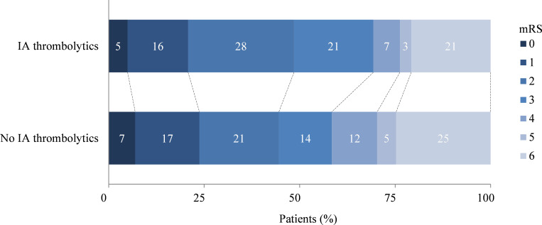 Results: Of the 2263 included patients, 95 (4.2%) received IA thrombolytics during EVT. The IA thrombolytics administered were urokinase (median dose, 250 000 IU (IQR, 1 93 750-2 50 000)) or alteplase (median dose, 20 mg (IQR, 12-20)). No association was found between IA thrombolytics and favourable functional outcome (adjusted OR (aOR), 1.16; 95% CI 0.71 to 1.90). Successful reperfusion was less often observed in those patients treated with IA thrombolytics (aOR, 0.57; 95% CI 0.36 to 0.90). The odds of sICH (aOR, 0.82; 95% CI 0.32 to 2.10) and early neurological recovery were comparable between patients treated with and without IA thrombolytics. For primary and adjuvant revascularisation attempts, IA thrombolytics were more often administered for proximal than for distal occlusions. Functional outcomes were comparable for patients receiving IA thrombolytics as a primary versus adjuvant revascularisation attempt.