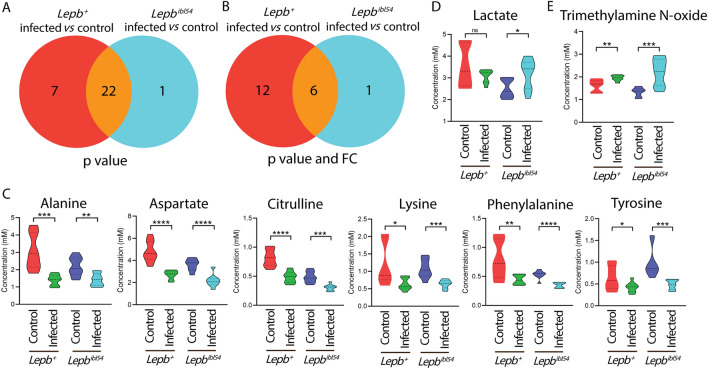 Results: The results show that leptin mutation leads to a similar metabolic syndrome as caused by mycobacterial infection in the two species, characterized by the decrease of 11 amine metabolites. In both species, this metabolic syndrome was not aggravated further when the leptin mutant was infected by mycobacteria. Therefore, we conclude that leptin and mycobacterial infection are both impacting metabolism non-synergistically. In addition, we studied the transcriptomes of lepbibl54 mutant zebrafish larvae and wild type (WT) siblings after mycobacterial infection. These studies showed that mycobacteria induced a very distinct transcriptome signature in the lepbibl54 mutant zebrafish compared to WT sibling control larvae. Furthermore, lepbibl55 Tg (pck1:luc1) zebrafish line was constructed and confirmed this difference in transcriptional responses.