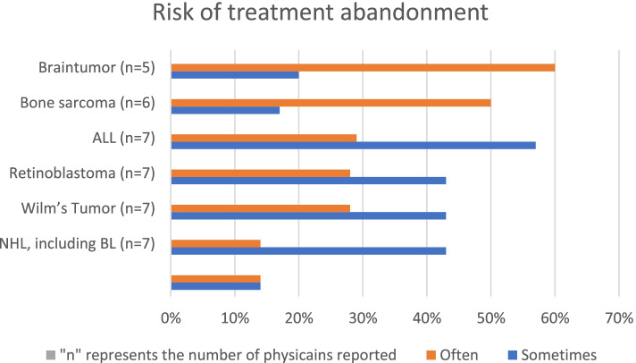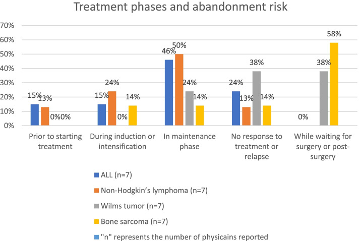 Results: The perceived mean abandonment rate in Ethiopia is 34% (SE 2.5%). The risk of treatment abandonment is dependent on the type of cancer (high for bone sarcoma and brain tumor), the phase of treatment and treatment outcome. The highest risk is during maintenance and treatment failure or relapse for acute lymphoblastic leukemia, and during pre- or post-surgical phase for Wilms tumor and bone sarcoma. The major influencing risk factors in Ethiopia includes high cost of care, low economic status, long travel time to treatment centers, long waiting time, belief in the incurability of cancer and poor public awareness about childhood cancer.