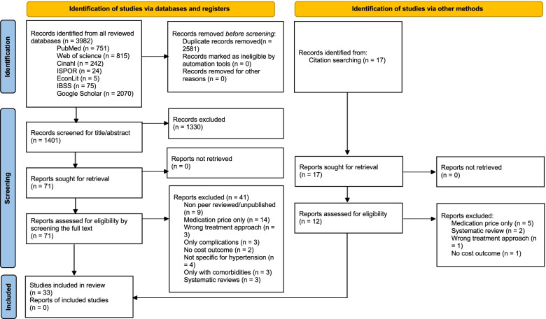 Material and methods: Systematic literature searches were conducted in multiple databases (e.g., PubMed, Web of Science, Google Scholar) for peer reviewed articles written in English language with a publication date from inception to Jan. 2022. We included studies assessing direct and indirect costs of hypertension therapy in SSA from a provider or user perspective. The search and a quality assessment were independently executed by two researchers. All results were converted to 2021 US Dollar.