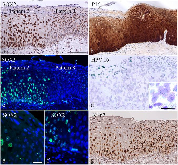 SOX2 expression in high-grade cervical intraepithelial neoplasia (CIN3) and cervical squamous cell carcinoma is increased compared to that in the normal cervical epithelium. However, data on the expression and histological distribution of SOX2 in squamous epithelium during progression of CIN are largely lacking. We studied SOX2 expression throughout the epithelium in 53 cases of CIN1, 2, and 3. In general, SOX2 expression increased and expanded from basal/parabasal to the intermediate/superficial compartment during early stages of progression of CIN. An unexpected, specific expression pattern was found in areas classified as CIN2 and CIN3. This pattern was characterized by the absence or low expression of SOX2 in the basal/parabasal compartment and variable levels in the intermediate and superficial compartments. It was significantly associated with CIN3 (p = 0.009), not found in CIN1 and only seen in part of the CIN2 lesions. When the different patterns were correlated with the genetic make-up and presence of HPV, the CIN3-related pattern contained HPV-positive cells in the basal/parabasal cell compartment that were disomic. This is in contrast to the areas exhibiting the CIN1 and CIN2 related patterns, which frequently exhibited aneusomic cells. Based on their SOX2 localisation pattern, CIN1 and CIN2 could be delineated from CIN3. These data shed new light on the pathogenesis and dynamics of progression in premalignant cervical lesions, as well as on the target cells in the epithelium for HPV infection.