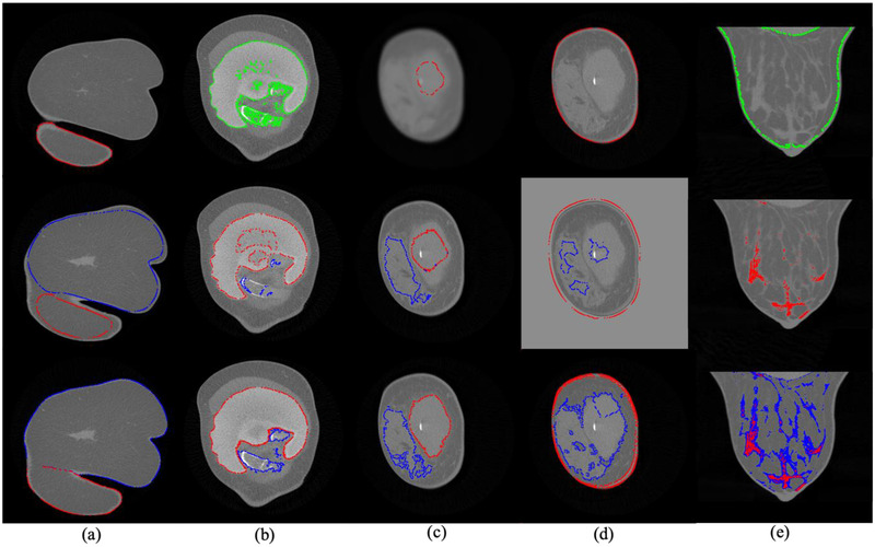 Results: The performance evaluation on each component and overall segmentation for 17 breast CT images resulted in DSCs ranging 0.90-0.97 and in DCs 0.01-0.08. The readers rated 4.5-4.8 (5 highest score) with an excellent inter-reader agreement. The breast density varied by 3.7%-7.1% when including mis-segmented muscle or skin.