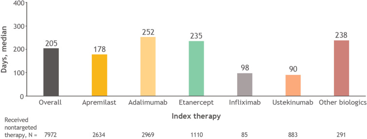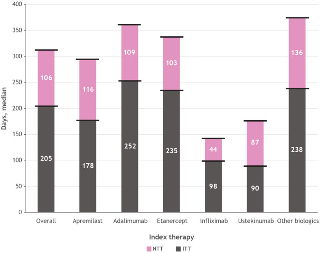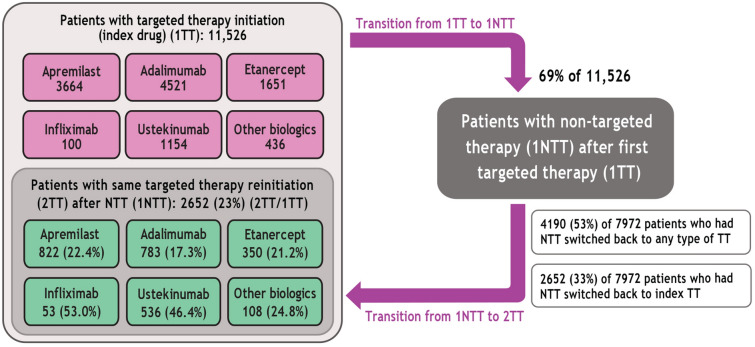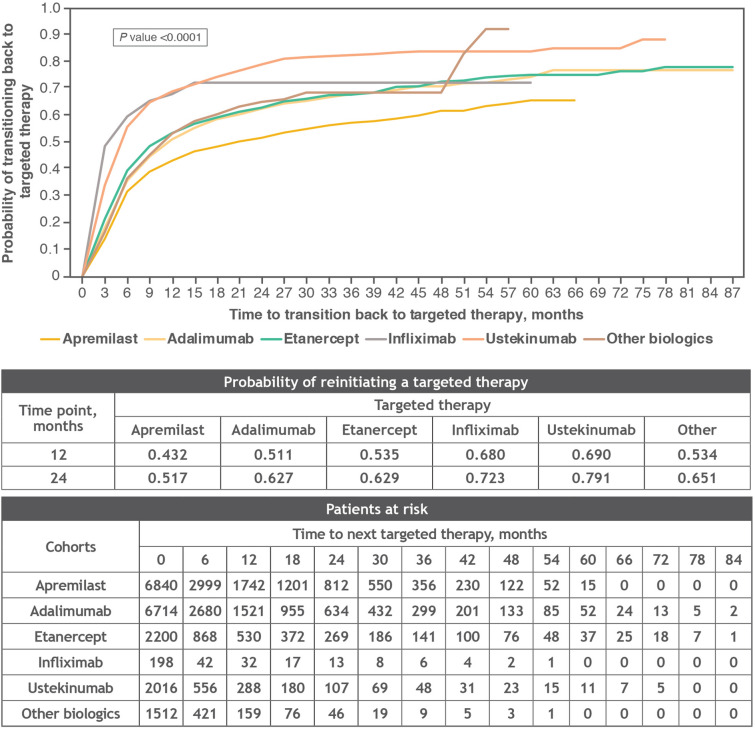 Results: A total of 11,526 patients with PsO were included; mean [standard deviation (SD)] age and Charlson Comorbidity Index score were 48.3 (12.8) years and 0.9 (1.43), respectively. During the follow-up, 69.2% of the patients were treated with NTT. Median time to first NTT, for those who received NTT, was 205 days (longest: adalimumab, 252 days). Among patients who switched to NTT after initiating treatment with TT, 52.6% reinitiated treatment with TT (least common: apremilast, 45.6%), with a median time to reinitiation of 106 days (longest: other biologics, 136 days). For all patients on NTT, the probability of reinitiating any TT was 60.7% at 24 months.