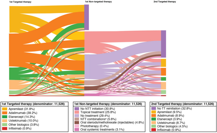 Methods: This retrospective study used IBM® MarketScan® Commercial and Medicare Databases (1/1/2006-3/31/2020) to evaluate treatment patterns in biologic- and apremilast-naive patients with PsO. TT included apremilast, adalimumab, etanercept, infliximab, ustekinumab, or other biologics (certolizumab pegol, secukinumab, brodalumab, ixekizumab, guselkumab, or tildrakizumab). Adults with ≥ 1 prescription for a TT, ≥ 2 PsO claims separated by ≥ 1 day on or before the index date (date of first TT prescription), and continuous medical and pharmacy enrollment for 1 year before and 2 years after the index date were eligible. Non-targeted therapy (NTT) was defined as non-targeted oral systemic treatment, topical treatment, phototherapy, or no treatment. Kaplan-Meier (KM) analysis was used to estimate time to reinitiation of TT (24-month continuous enrollment post-index was not required).