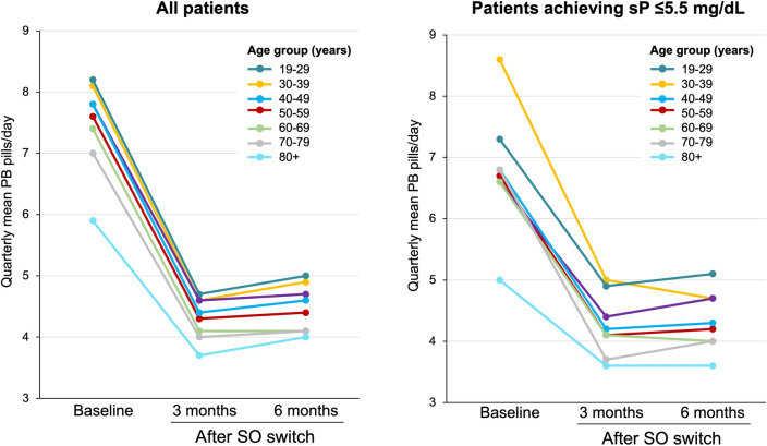 Results: At baseline, older patients had lower mean sP, serum albumin, and pre-dialysis weights compared with younger patients. Prescription of SO was associated with a 62% increase in the proportion of patients achieving sP ≤ 5.5 mg/dl and a 42% reduction in daily pill burden. The proportion of patients achieving sP ≤ 5.5 mg/dl after transitioning to SO increased by 113, 96, 68, 77, 61, 37 and 40% among those aged 19-29, 30-39, 40-49, 50-59, 60-69, 70-79, and ≥ 80 years, respectively.