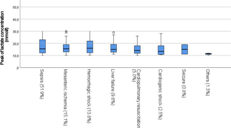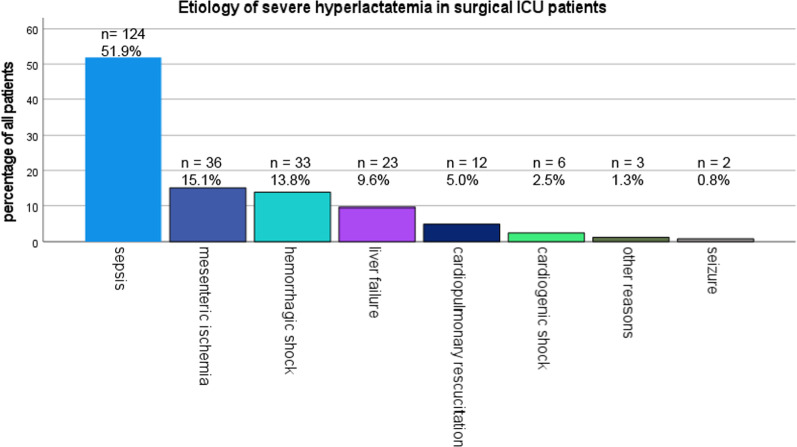 Methods: Overall, 239 surgical patients with severe hyperlactatemia (> 10 mmol/L) who were treated in the surgical ICU at the University Medical Center Freiburg between June 2011 and August 2017, were included in this study. The cause of the hyperlactatemia as well as the postoperative course and the patient morbidity and mortality were retrospectively analyzed. Lactate clearance was calculated by comparing lactate level 12 h after first measurement of > 10 mmol/L.