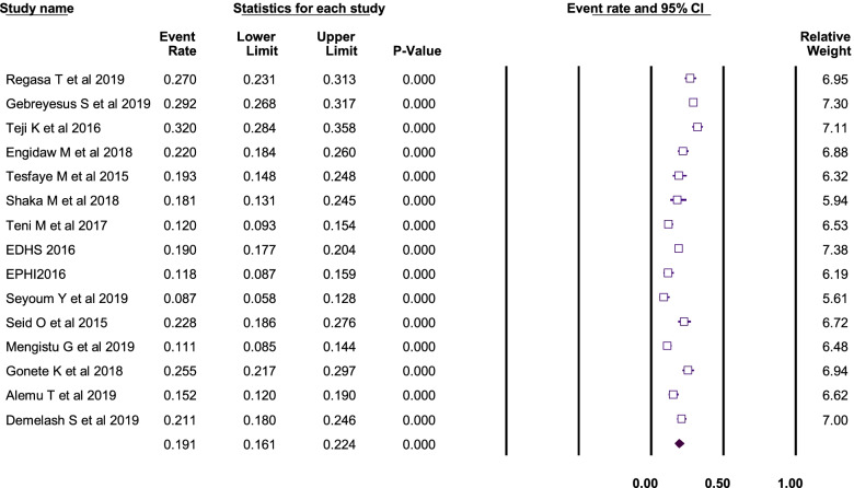 Result: In this review, we included a total of 15 studies with 9,669 adolescent girls. Using the random-effects model, the pooled magnitude of anemia among the Ethiopian adolescent girls was 19.1% (95%CI: 16.1%, 24.6%). The associated factors were attained menarche (adjusted odds ratio (AOR) = 1.96), ≥ 5 days of blood flow during menses (AOR = 6.21), food insecurity (AOR = 1.48), inadequate diet diversity score (AOR = 2.81), presence of intestinal parasite (AOR = 3.51), low body mass index (AOR = 2.49), and rural residence (AOR = 1.79).