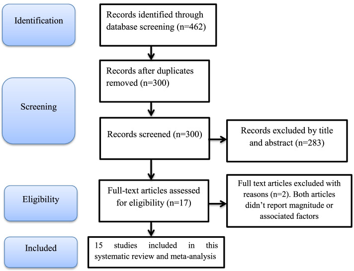 Methods: The authors used a preferred reporting item for systematic reviews and meta-analysis (PRISMA). We included articles and survey reports published until May 2021 using searching engines of Google, Google Scholar, PubMed, Scopus, and Cumulative Index to Nursing and Allied Health Literature. To assess the quality of studies, we used Newcastle-Ottawa quality assessment scale for non-randomized. Two authors independently assessed the quality of the studies. We computed the pool magnitude and odds ratio of the associated factors with their 95%CI using Comprehensive Meta-Analysis software. Publication bias assessed using funnel plots and Egger's test.