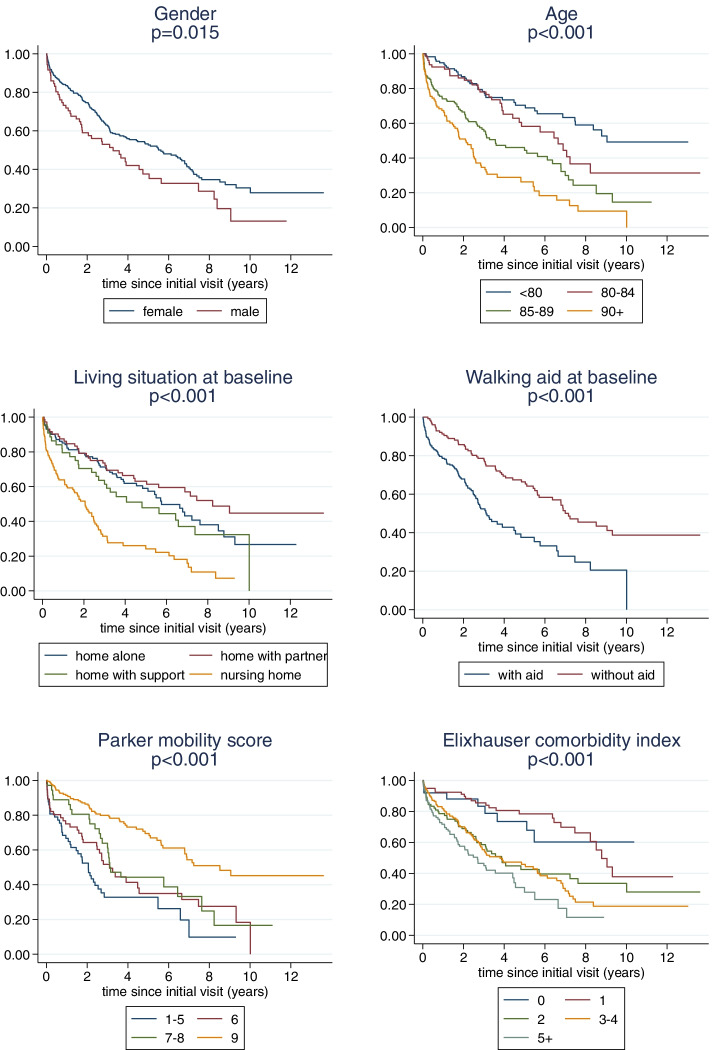 Results: Overall, 428 patients (83.4% female) with a mean age of 83.7 years were included. Two thirds of patients were still living in their home and mobile without walking aid at baseline. In-hospital mortality was 0.7%, overall, one-year mortality 16.9%. An independent and significant association of age, gender and comorbidities to overall survival was found. Further, the occurrence of a horizontal sacral fracture as well as a ventral comminution or dislocation was associated with an increased mortality. The effect of a horizontal sacral fracture was more accentuated in low-risk patients while the ventral fracture components showed a larger effect on survival in high-risk patients.