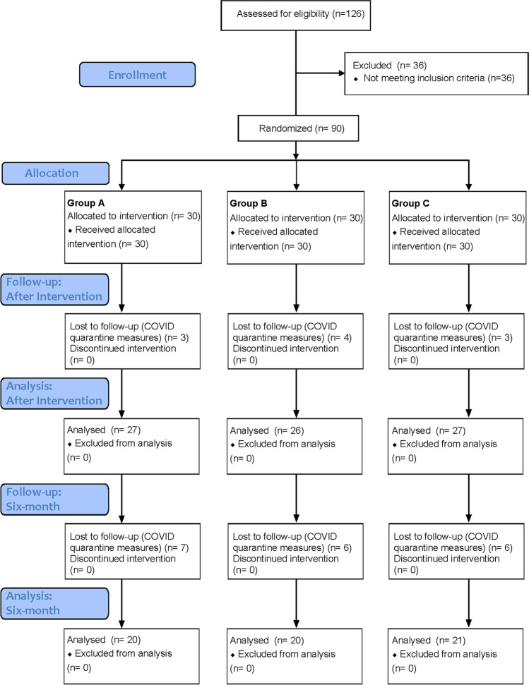 Materials and methods: A randomized controlled trial was designed with three parallel groups: group A - in-office 6% HP paint-on varnish; group B - at-home 6% HP with adaptable tray; group C - at-home 16% carbamide peroxide with custom tray. At three different stages (baseline, after bleaching, and 6-month follow-up), ORHQoL was evaluated by the OHIP-14 questionnaire and tooth color of the upper canines and central incisors were measured by two shade guides and a spectrophotometer (measuring CIE L*a*b* with respective color/whiteness differences - ΔE00/ΔWID). Results were presented as mean and 95% confidence intervals and statistical tests were performed appropriately, considering a significance level of α = 0.05.