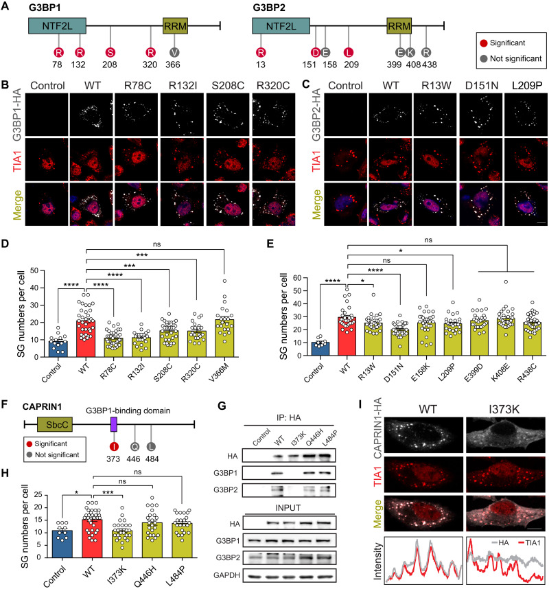 (A) Schematic protein structure of G3BP1 and G3BP2 showing the NTF2L domain and RRM region. The positions of de novo missense variants affecting SG formation are shown in red. The positions of de novo missense variants unaffecting SG assembly are shown in gray. (B and C) Immunofluorescence imaging of the WT and mutant proteins of G3BP1/2 (HA, gray) and endogenous TIA1 (red) as SG markers in transfected G3BP1/2 KO cells under stress conditions. Scale bar, 10 μm. (D and E) Quantification of SG numbers per cell for G3BP1/2 WT and variants. (D) Control, 14 cells; WT, 34 cells; R78C, 41 cells; R132I, 23 cells; S208C, 33 cells; R320C, 24 cells; V366M, 21 cells. (E) Control, 9 cells; WT, 30 cells; R13W, 32 cells; D151N, 32 cells; E158K, 29 cells; L209P, 28 cells; E399D, 27 cells; K408E, 30 cells; R438C, 32 cells. (F) Schematic protein structure of CAPRIN1 showing the domain of SbcC and G3BP1 binding. The positions of de novo missense variants that affected (red) and did not affect (gray) SG assembly are shown. (G) Coimmunoprecipitation assay of CAPRIN1 mutant proteins and G3BP1/2. CAPRIN1-HA-IP lysate from CAPRIN1 KO HeLa cells transfected with WT and mutant constructs was subjected to SDS-PAGE and immunoblot with G3BP1/2. Input was applied as protein-level controls. (H) Quantification of SG numbers per cell for CAPRIN1 WT and variants (Control, 10 cells; WT, 32 cells; I373K, 25 cells; Q446H, 23 cells; L484P, 23cells). (I) Immunofluorescence imaging of WT and mutant proteins of CAPRIN1 (HA, gray) and endogenous TIA1 (red) as SG marker in transfected CAPRIN1 KO cells under stress conditions. Scale bar, 10 μm. Immunofluorescence intensity lines of CAPRIN1 WT, CAPRIN1 I373K mutant, and SG marker TIA1 are plotted. *P < 0.05, ***P < 0.001, and ****P < 0.0001.
