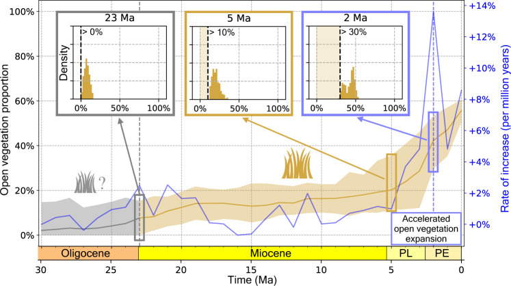 Some of the most extensive terrestrial biomes today consist of open vegetation, including temperate grasslands and tropical savannas. These biomes originated relatively recently in Earth's history, likely replacing forested habitats in the second half of the Cenozoic. However, the timing of their origination and expansion remains disputed. Here, we present a Bayesian deep learning model that utilizes information from fossil evidence, geologic models, and paleoclimatic proxies to reconstruct paleovegetation, placing the emergence of open habitats in North America at around 23 million years ago. By the time of the onset of the Quaternary glacial cycles, open habitats were covering more than 30% of North America and were expanding at peak rates, to eventually become the most prominent natural vegetation type today. Our entirely data-driven approach demonstrates how deep learning can harness unexplored signals from complex data sets to provide insights into the evolution of Earth's biomes in time and space.