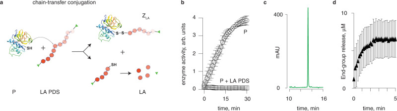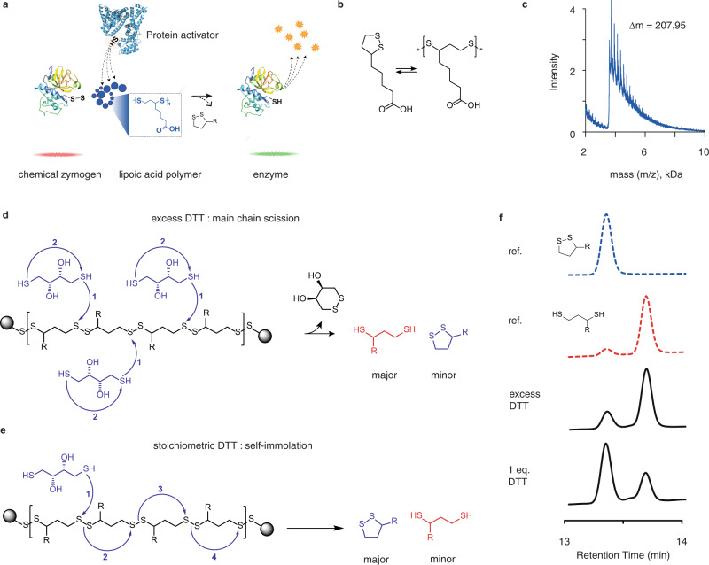 We present three classes of chemical zymogens established around the protein cysteinome. In each case, the cysteine thiol group was converted into a mixed disulfide: with a small molecule, a non-degradable polymer, or with a fast-depolymerizing fuse polymer (ZLA). The latter was a polydisulfide based on naturally occurring molecule, lipoic acid. Zymogen designs were applied to cysteine proteases and a kinase. In each case, enzymatic activity was successfully masked in full and reactivated by small molecule reducing agents. However, only ZLA could be reactivated by protein activators, demonstrating that the macromolecular fuse escapes the steric bulk created by the protein globule, collects activation signal in solution, and relays it to the active site of the enzyme. This afforded first-in-class chemical zymogens that are activated via protein-protein interactions. We also document zymogen exchange reactions whereby the polydisulfide is transferred between the interacting proteins via the "chain transfer" bioconjugation mechanism.
