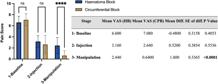 Results: Patients receiving CPB experienced significantly less pain scores during manipulation (VAS = 0.64) compared with HB (VAS = 2.44) (p = < 0.0001). There were no significant differences between groups at baseline (P = 0.55) and injection (P = 0.40) stages.