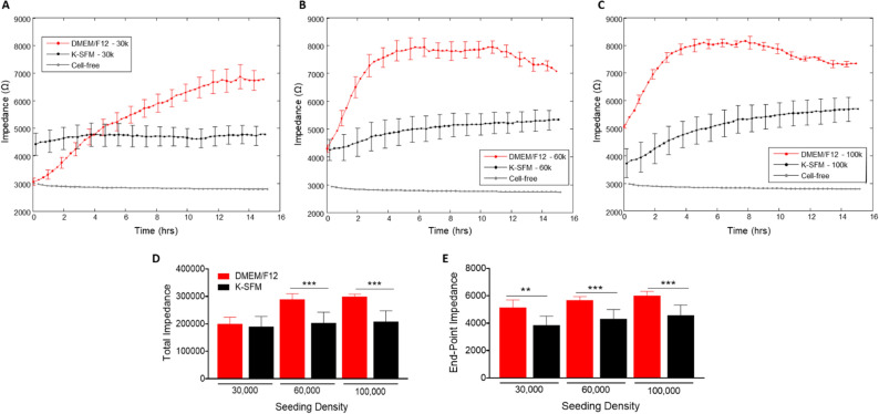 An intact epithelium is key to maintaining corneal integrity and barrier function which can lead to impaired ocular defense and sight-threatening opacity when compromised. Electrical cell-substrate impedance sensing or ECIS is a non-invasive method to measure real-time cellular behaviors including barrier function and cell migration. The current study uses ECIS technology to assess and optimize human telomerase-immortalized corneal epithelial cells to generate quantifiable measurements that accurately reflect changes in cell behavior in vitro. Five cell densities were assessed in two different media to determine the optimal conditions for monitoring of cellular behavior over time. Parameters of evaluation included: overall impedance (Z), barrier resistance (R), cell capacitance (C), and mathematical modeling of the R data to further generate Rb (the electrical resistance between HUCLs), α (the resistance between the HUCLs and the substrate), and Cm (the capacitance of the cell membrane) measurements. All parameters of assessment strongly indicated DMEM/F12 at 60,000 cells as the optimal condition for ECIS assessment of HUCLs. Furthermore, this work highlights the ability of the sensitive ECIS biosensor technology to comprehensively and quantitatively assess corneal epithelial cell structure and function and the importance of optimizing not only cell density, but choice of media used for in vitro culturing.