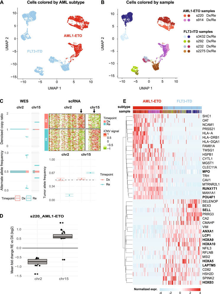 Conclusions: In summary, the single cell RNA data underpinned the tumor heterogeneity not only amongst patient blasts with similar initiating mutations but also between each Dx-Re pair. Our results suggest alternatively and currently unappreciated and unexplored mechanisms leading to therapeutic resistance and AML recurrence.