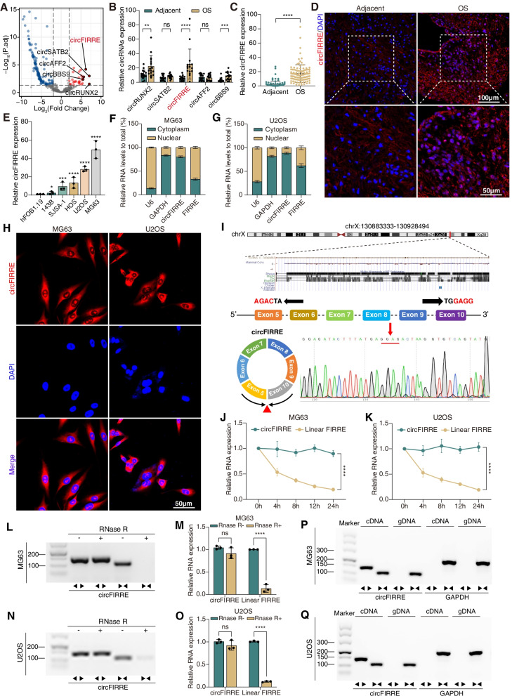 Methods: circFIRRE was selected from RNA-sequencing of 4 matched osteosarcoma and adjacent samples. The expression of circFIRRE was verified in clinical osteosarcoma samples and cell lines via quantitative real-time polymerase chain reaction (RT-qPCR). The effect of circFIRRE was investigated in cell lines in vitro models, ex vivo models and in vivo xenograft tumor models, including proliferation, invasion, migration, metastasis and angiogenesis. Signaling regulatory mechanism was evaluated by RT-qPCR, Western blot, RNA pull-down and dual-luciferase reporter assays.