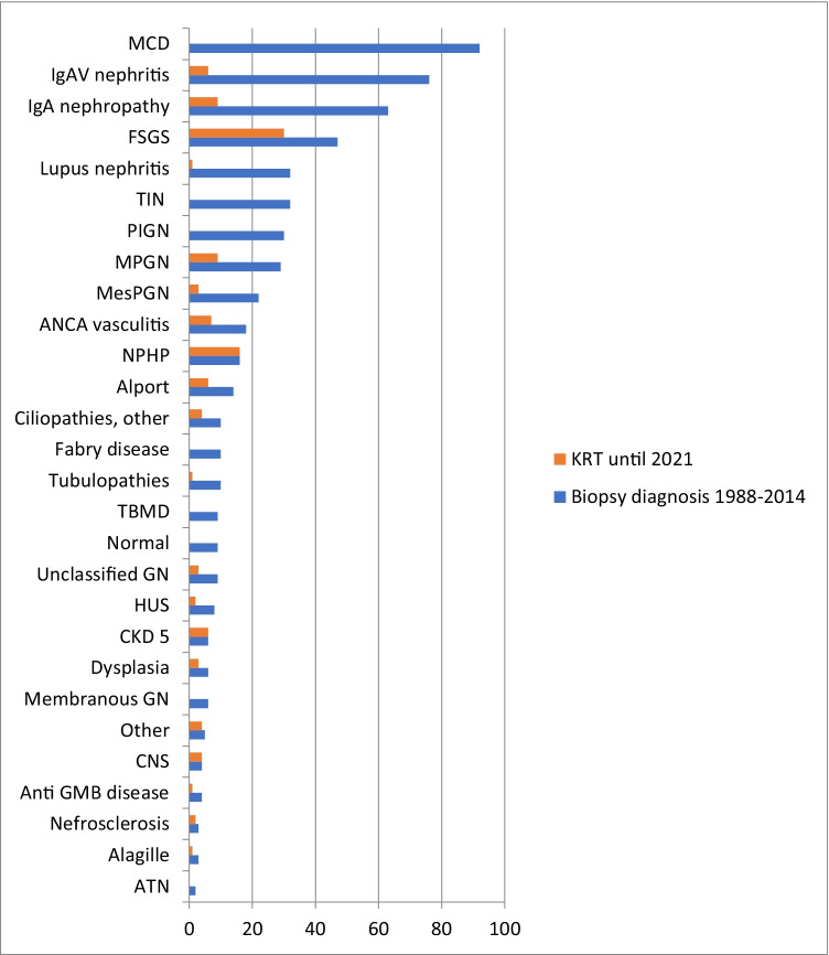 Results: In total, 575 children with a median (interquartile range, IQR) age of 10.7 (6.1 to 14.1) years were included, and median follow-up time (IQR) after kidney biopsy was 14.3 (range 8.9 to 21.6) years. The most common biopsy diagnoses were minimal change disease (MCD; n = 92), IgA vasculitis nephritis (IgAVN; n = 76), IgA nephropathy (n = 63), and focal and segmental glomerulosclerosis (FSGS; n = 47). In total, 118 (20.5%) of the biopsied children reached CKD 5, median (IQR) time to KRT 2.3 years (7 months to 8.4 years). Most frequently, nephronophthisis (NPHP; n = 16), FSGS (n = 30), IgA nephropathy (n = 9), and membranoproliferative glomerulonephritis (MPGN; n = 9) led to KRT.