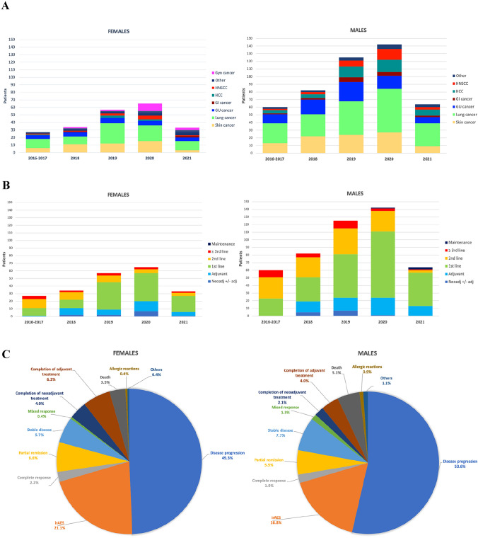 Conclusions: ICI play an increasingly important role in oncology. irAEs are more frequent in female patients and are associated with a longer OS. More research is needed to understand the association between patient sex and toxicity and survival.