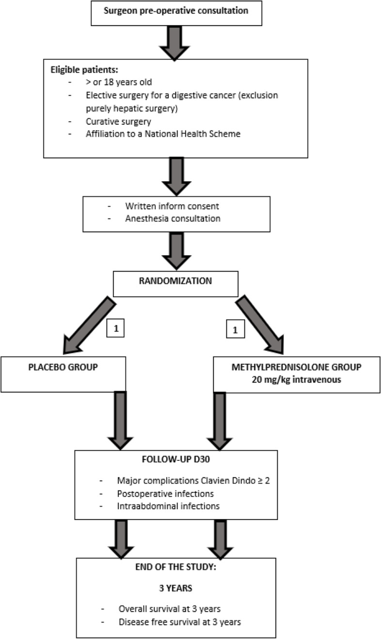 Methods: The CORTIFRENCH trial is a phase III multicenter randomized double-blind placebo-controlled trial to assess the impact of a flash dose of preoperative corticosteroids versus placebo on postoperative morbidity and cancer-related outcomes after elective curative-intent surgery for digestive cancer. The primary endpoint is the frequency of patients with postoperative major complications occurring within 30 days after surgery (defined as all complications with Clavien-Dindo grade > 2). The secondary endpoints are the overall survival at 3 years, the disease-free survival at 3 years, the frequency of patients with intraabdominal infections and postoperative infections within 30 days after surgery and the hospital length of stay. We hypothesize a reduced risk of major complications and a better disease-survival at 3 years in the experimental group. Allowing for 5% of drop-out, 1 200 patients (600 per arm) should be included.