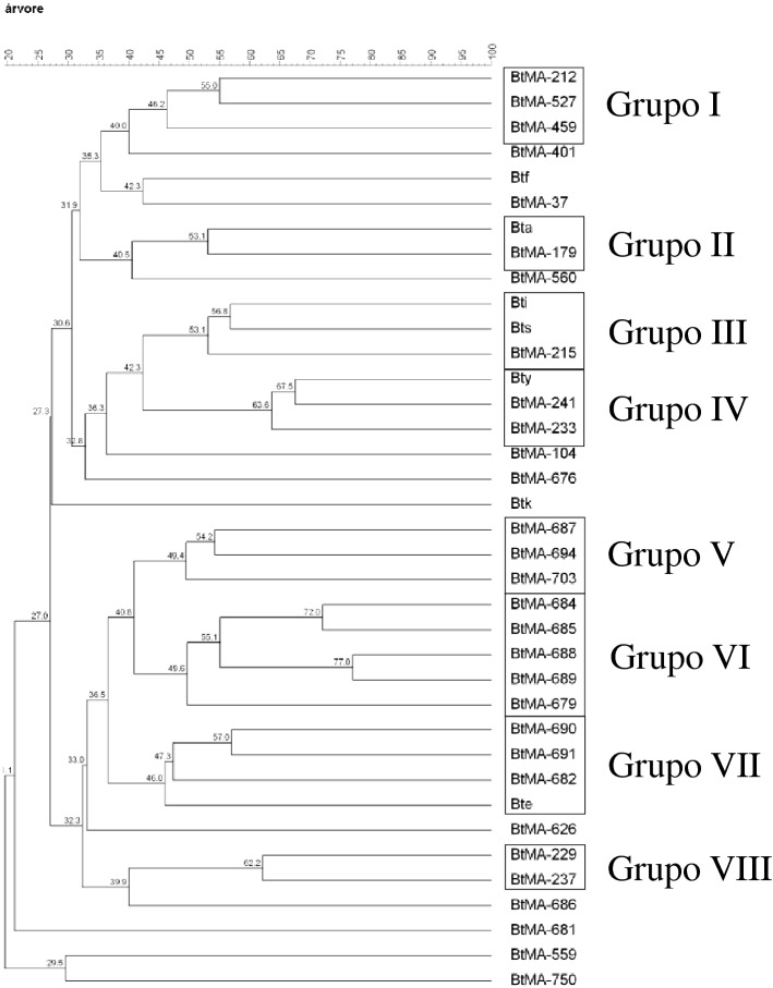 Bacillus thuringiensis (Bt) isolates native to Maranhão (BtMA) that are highly toxic to Aedes aegypti larvae and seven standard subspecies of Bt were analyzed for genetic diversity using the rep-PRC technique with BOX, ERIC, REP, MB1, and GTG5 markers. The rep-PCR technique is considered an extremely reliable, reproducible, fast and highly discriminatory technique that may be used even among populations of the same species. These five markers revealed a total of 38 polymorphic DNA fragments for 30 BtMA isolates. Eight groups were obtained with the dendrogram generated through Pearson's correlation analysis, with four groups formed only with BtMA isolates and four comprised of isolates of BtMA and the standard subspecies toxic to dipterans and lepidopterans. Despite the high genetic diversity of BtMA, a low correlation between the collection site, gene content and mortality against A. aegypti larvae was evidenced. The clustering of the standard subspecies of Bt that were toxic against dipterans with BtMA isolates confirm the mosquitocidal action of the native isolates from Maranhão, and they can be used as an alternative for A. aegypti control and other insects of medical importance and for the control of agricultural pests.