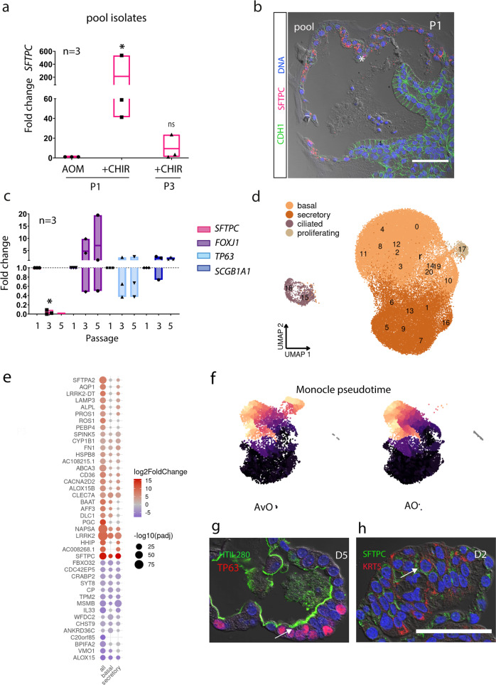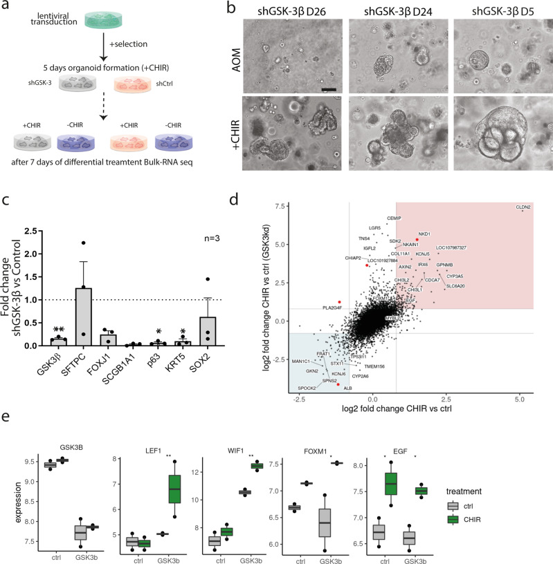 Mechanisms of epithelial renewal in the alveolar compartment remain incompletely understood. To this end, we aimed to characterize alveolar progenitors. Single-cell RNA-sequencing (scRNA-seq) analysis of the HTII-280+/EpCAM+ population from adult human lung revealed subclusters enriched for adult stem cell signature (ASCS) genes. We found that alveolar progenitors in organoid culture in vitro show phenotypic lineage plasticity as they can yield alveolar or bronchial cell-type progeny. The direction of the differentiation is dependent on the presence of the GSK-3β inhibitor, CHIR99021. By RNA-seq profiling of GSK-3β knockdown organoids we identified additional candidate target genes of the inhibitor, among others FOXM1 and EGF. This gives evidence of Wnt pathway independent regulatory mechanisms of alveolar specification. Following influenza A virus (IAV) infection organoids showed a similar response as lung tissue explants which confirms their suitability for studies of sequelae of pathogen-host interaction.