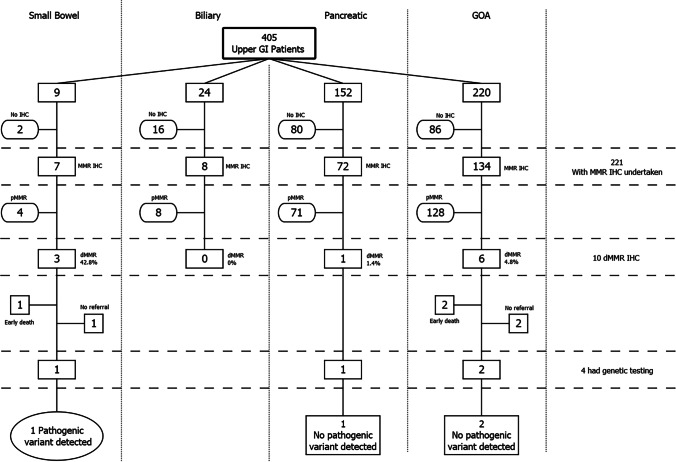 Results: Of 394 patients with CRC, 346 (87.8%) had MMR IHC testing. Thirty-eight of 346 (10.9%) were MMR deficient (MMR-D) and 5 (1.4%) were found to have pathogenic germline variants causing Lynch syndrome. Of 405 patients with upper GI cancers, 221 (54.6%) had MMR IHC testing. Ten of 221 (4.5%) were MMR-D and 1 (0.5%) had a pathogenic germline variant causing Lynch syndrome.