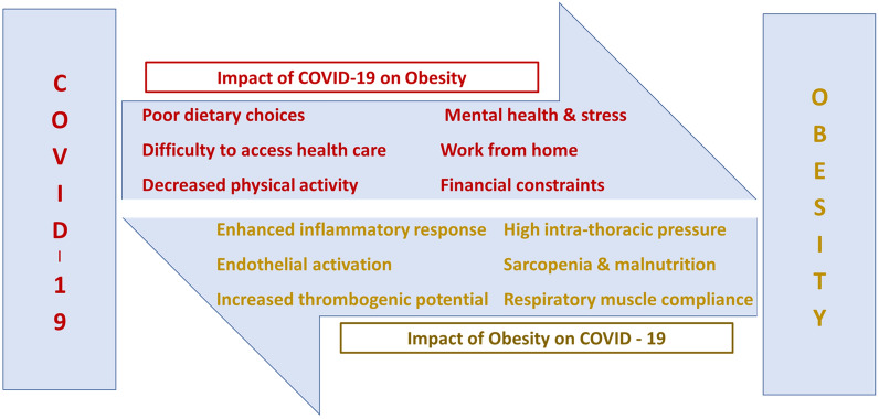 The severe acute respiratory syndrome coronavirus 2 (SARS-CoV-2), responsible for the COVID-19 pandemic, has been shown to disrupt many organ systems in the human body. Though several medical disorders have been affected by this infection, a few illnesses in addition may also play a role in determining the outcome of COVID-19. Obesity is one such disease which is not only affected by the occurrence of COVID-19 but can also result in a worse clinical outcome of COVID-19 infection. This manuscript summarizes the most recent evidence supporting the bidirectional impact of COVID-19 and obesity. It highlights how the presence of obesity can be detrimental to the outcome of COVID-19 in a given patient because of the mechanical limitations in lung compliance and also by the activation of several thrombo-inflammatory pathways. The sociodemographic changes brought about by the pandemic in turn have facilitated the already increasing prevalence of obesity. This manuscript highlights the importance of recognizing these pathways which may further help in policy changes that facilitate appropriate measures to prevent the further worsening of these two pandemics.
