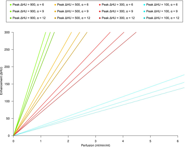 Methods: CTPI scans (each with 40 frames acquired every 1.5 s) of 11 patients with advanced hepatocellular carcinoma (HCC) enrolled between 2012 and 2016 were retrospectively analysed (aged 69 ± 9 years, 8/11 males). Perfusion was defined as the maximal slope of the time-enhancement curve divided by the peak enhancement of the feeding vessel (aorta). Perfusion was computed two times, first using the maximum slope derived from all data points and then using the peak tissue enhancement and the bolus shape obtained from the aortic curve.