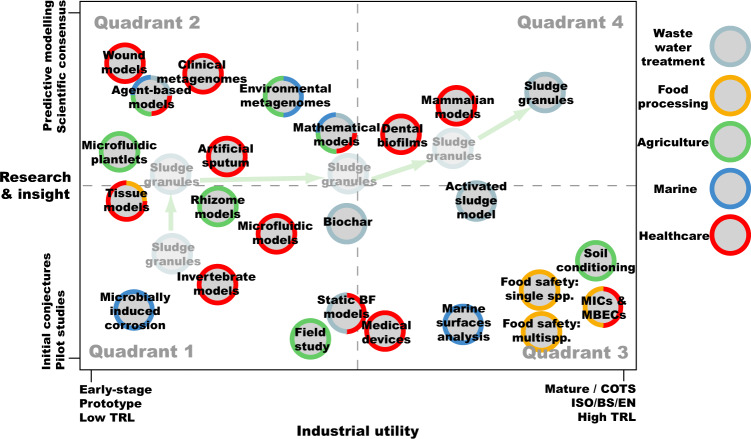 Biofilms are increasingly recognised as a critical global issue in a multitude of industries impacting health, food and water security, marine sector, and industrial processes resulting in estimated economic cost of $5 trillion USD annually. A major barrier to the translation of biofilm science is the gap between industrial practices and academic research across the biofilms field. Therefore, there is an urgent need for biofilm research to notice and react to industrially relevant issues to achieve transferable outputs. Regulatory frameworks necessarily bridge gaps between different players, but require a clear, science-driven non-biased underpinning to successfully translate research. Here we introduce a 2-dimensional framework, termed the Biofilm Research-Industrial Engagement Framework (BRIEF) for classifying existing biofilm technologies according to their level of scientific insight, including the understanding of the underlying biofilm system, and their industrial utility accounting for current industrial practices. We evidence the BRIEF with three case studies of biofilm science across healthcare, food & agriculture, and wastewater sectors highlighting the multifaceted issues around the effective translation of biofilm research. Based on these studies, we introduce some advisory guidelines to enhance the translational impact of future research.