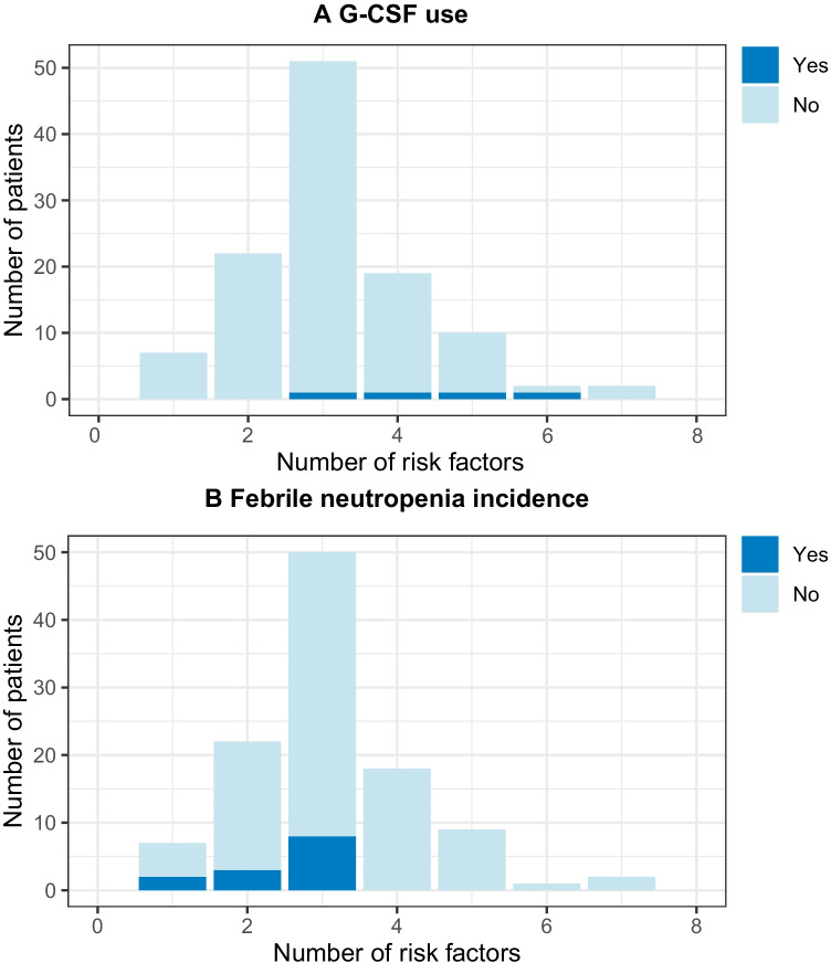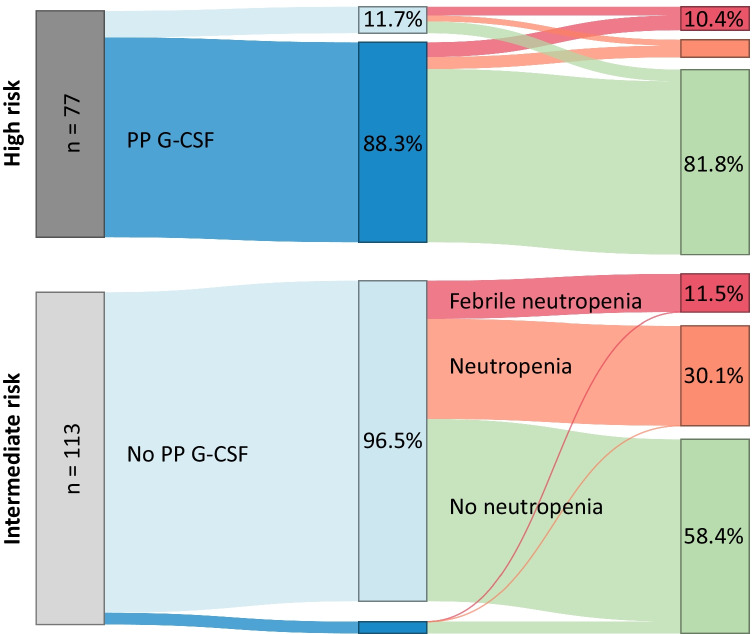 Results: A total of 190 female patients were included, who received 77 HR and 113 IR treatments. In 88.3% of the HR regimens, G-CSF was administered; 7.3% of these patients developed FN vs. 33.3% without G-CSF. Although most IR regimen patients had ≥ 2 risk factors, only 4% received G-CSF, of which none developed neutropenia. However, without G-CSF, 11.9% developed FN and 31.2% severe neutropenia.