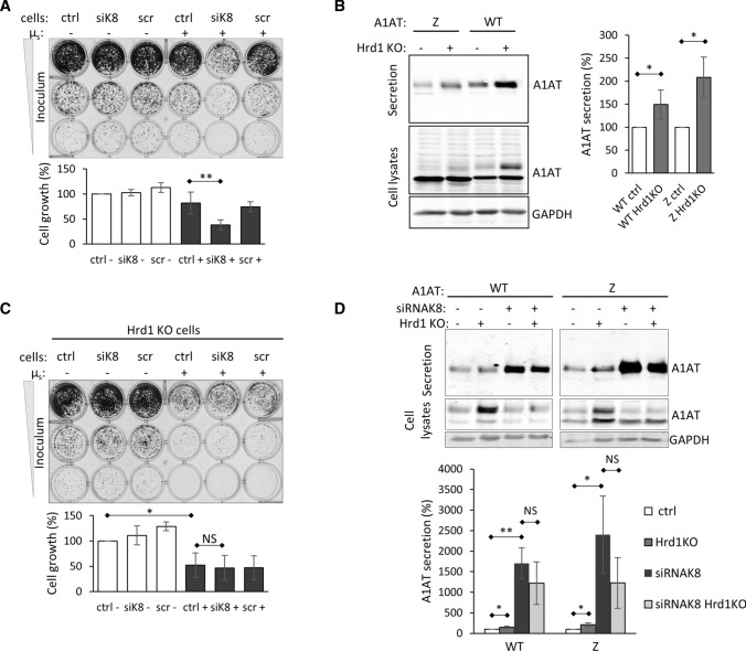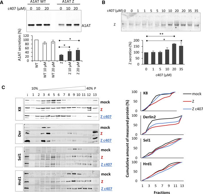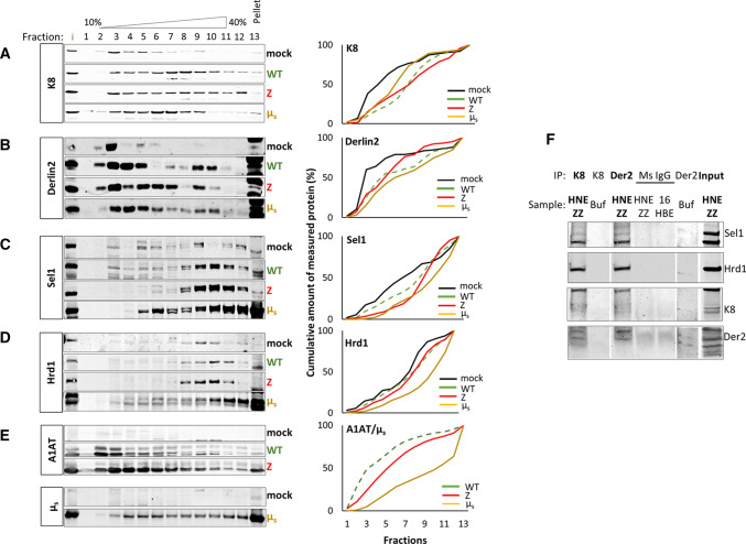 Early recognition and enhanced degradation of misfolded proteins by the endoplasmic reticulum (ER) quality control and ER-associated degradation (ERAD) cause defective protein secretion and membrane targeting, as exemplified for Z-alpha-1-antitrypsin (Z-A1AT), responsible for alpha-1-antitrypsin deficiency (A1ATD) and F508del-CFTR (cystic fibrosis transmembrane conductance regulator) responsible for cystic fibrosis (CF). Prompted by our previous observation that decreasing Keratin 8 (K8) expression increased trafficking of F508del-CFTR to the plasma membrane, we investigated whether K8 impacts trafficking of soluble misfolded Z-A1AT protein. The subsequent goal of this study was to elucidate the mechanism underlying the K8-dependent regulation of protein trafficking, focusing on the ERAD pathway. The results show that diminishing K8 concentration in HeLa cells enhances secretion of both Z-A1AT and wild-type (WT) A1AT with a 13-fold and fourfold increase, respectively. K8 down-regulation triggers ER failure and cellular apoptosis when ER stress is jointly elicited by conditional expression of the µs heavy chains, as previously shown for Hrd1 knock-out. Simultaneous K8 silencing and Hrd1 knock-out did not show any synergistic effect, consistent with K8 acting in the Hrd1-governed ERAD step. Fractionation and co-immunoprecipitation experiments reveal that K8 is recruited to ERAD complexes containing Derlin2, Sel1 and Hrd1 proteins upon expression of Z/WT-A1AT and F508del-CFTR. Treatment of the cells with c407, a small molecule inhibiting K8 interaction, decreases K8 and Derlin2 recruitment to high-order ERAD complexes. This was associated with increased Z-A1AT secretion in both HeLa and Z-homozygous A1ATD patients' respiratory cells. Overall, we provide evidence that K8 acts as an ERAD modulator. It may play a scaffolding protein role for early-stage ERAD complexes, regulating Hrd1-governed retrotranslocation initiation/ubiquitination processes. Targeting K8-containing ERAD complexes is an attractive strategy for the pharmacotherapy of A1ATD.