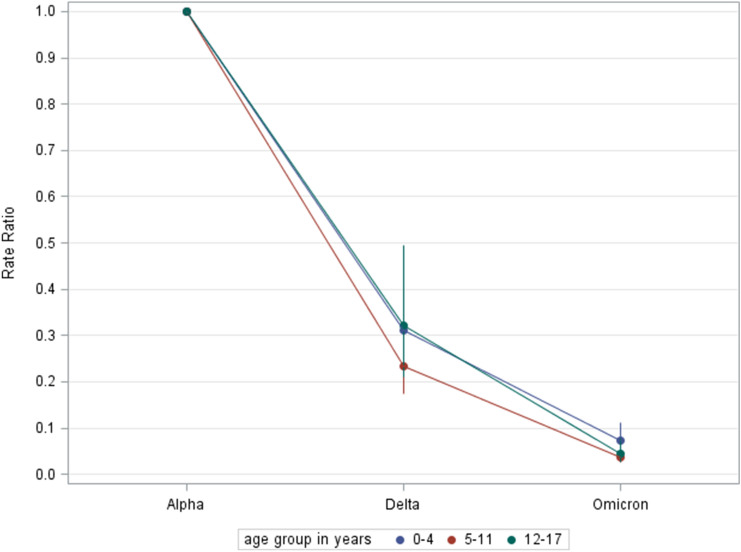 Results: The PIMS-TS rate changed significantly over time. When the Alpha VOC was dominant [calendar week (CW) 11 in March-CW 31 in August 2021], the PIMS-TS rate was 6.19 [95% confidence intervals (95% CI) 5.17, 7.20]. When Delta prevailed (CW 32 in August 2021-CW 4 in January 2022), the rate decreased to 1.68 (95% CI 1.49, 1.87). During the Omicron phase (CW 5 in January-CW 16 in April 2022), the rate fell further to 0.89 (95% CI 0.79, 1.00). These changes correspond to a decreased PIMS-TS rate of 73% (rate ratio 0.271, 95% CI 0.222; 0.332) and 86% (rate ratio 0.048, 95% CI 0.037; 0.062), respectively, in comparison to the Alpha period. Rate ratios were nearly identical for all age groups.