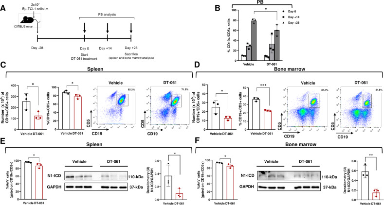 NOTCH1 alterations have been associated with chronic lymphocytic leukemia (CLL), but the molecular mechanisms underlying NOTCH1 activation in CLL cells are not completely understood. Here, we show that GSK3β downregulates the constitutive levels of the active NOTCH1 intracellular domain (N1-ICD) in CLL cells. Indeed, GSK3β silencing by small interfering RNA increases N1-ICD levels, whereas expression of an active GSK3β mutant reduces them. Additionally, the GSK3β inhibitor SB216763 enhances N1-ICD stability at a concentration at which it also increases CLL cell viability. We also show that N1-ICD is physically associated with GSK3β in CLL cells. SB216763 reduces GSK3β/N1-ICD interactions and the levels of ubiquitinated N1-ICD, indicating a reduction in N1-ICD proteasomal degradation when GSK3β is less active. We then modulated the activity of two upstream regulators of GSK3β and examined the impact on N1-ICD levels and CLL cell viability. Specifically, we inhibited AKT that is a negative regulator of GSK3β and is constitutively active in CLL cells. Furthermore, we activated the protein phosphatase 2 A (PP2A) that is a positive regulator of GSK3β, and has an impaired activity in CLL. Results show that either AKT inhibition or PP2A activation reduce N1-ICD expression and CLL cell viability in vitro, through mechanisms mediated by GSK3β activity. Notably, for PP2A activation, we used the highly specific activator DT-061, that also reduces leukemic burden in peripheral blood, spleen and bone marrow in the Eµ-TCL1 adoptive transfer model of CLL, with a concomitant decrease in N1-ICD expression. Overall, we identify in GSK3β a key component of the network regulating N1-ICD stability in CLL, and in AKT and PP2A new druggable targets for disrupting NOTCH1 signaling with therapeutic potential.