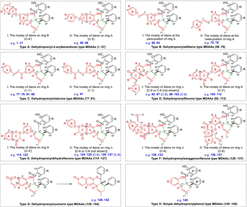 Mulberry Diels-Alder-type adducts (MDAAs) are unique phenolic natural products biosynthetically derived from the intermolecular [4 + 2]-cycloaddition of dienophiles (mainly chalcones) and dehydroprenylphenol dienes, which are exclusively distributed in moraceous plants. A total of 166 MDAAs with diverse skeletons have been isolated and identified since 1980. Structurally, the classic MDAAs characterized by the chalcone-skeleton dienophiles can be divided into eight groups (Types A - H), while others with non-chalcone dienophiles or some variations of classic MDAAs are non-classic MDAAs (Type I). These compounds have attracted significant attention of natural products and synthetic chemists due to their complex architectures, remarkable biological activities, and synthetic challenges. The present review provides a comprehensive summary of the structural properties, bioactivities, and syntheses of MDAAs. Cited references were collected between 1980 and 2021 from the SciFinder, Web of Science, and China National Knowledge Internet (CNKI).