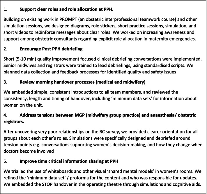 Methods: In collaboration with clinical teams, we implemented structural, process and relational interventions to improve teamwork in PPH cases. We were guided by the conceptual framework of Relational Coordination and used a mixed methods approach to data collection and analysis. We employed translational simulation as a central, but not singular, technique for enabling exploration and improvement. Key themes were identified from surveys, focus groups, simulation sessions, interviews, and personal communications over a 12-month period.