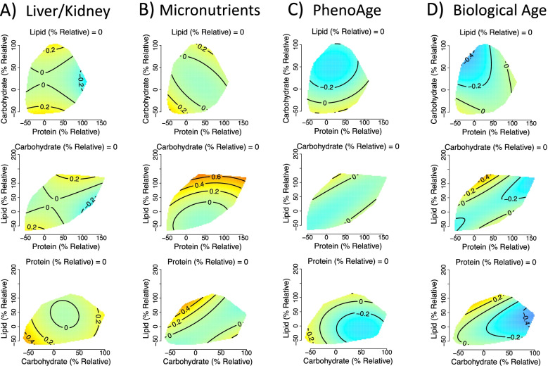 Results: Ageing and age-related loss of homeostasis (physiological dysregulation) were quantified via the integration of blood biomarkers. The effects of diet were modelled using the geometric framework for nutrition, applied to macronutrients and 19 micronutrients/nutrient subclasses. We observed four broad patterns: (1) The optimal level of nutrient intake was dependent on the ageing metric used. Elevated protein intake improved/depressed some ageing parameters, whereas elevated carbohydrate levels improved/depressed others; (2) There were non-linearities where intermediate levels of nutrients performed well for many outcomes (i.e. arguing against a simple more/less is better perspective); (3) There is broad tolerance for nutrient intake patterns that don't deviate too much from norms ('homeostatic plateaus'). (4) Optimal levels of one nutrient often depend on levels of another (e.g. vitamin E and vitamin C). Simpler linear/univariate analytical approaches are insufficient to capture such associations. We present an interactive tool to explore the results in the high-dimensional nutritional space.