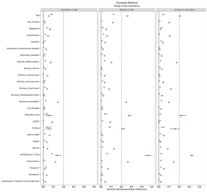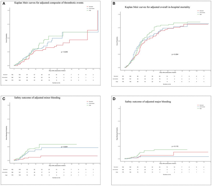 Results: A total of 811 patient records were reviewed, with 551 (standard-dose = 192, intermediate-dose = 180, and high-dose = 179) included in the analysis. After using weights matching, we found that the standard-dose group was not associated with an increase in the composite thrombotic events endpoint when compared to the intermediate-dose group {19.8 vs. 25%; adjusted hazard ratio (aHR) =1.46, [95% confidence of interval (CI), 0.94-2.26]} or when compared to high-dose group [19.8 vs. 24%; aHR = 1.22 (95% CI, 0.88-1.72)]. Also, there were no statistically significant differences in overall in-hospital mortality between the standard-dose and the intermediate-dose group [51 vs. 53.4%; aHR = 1.4 (95% CI, 0.88-2.33)] or standard-dose and high-dose group [51 vs. 61.1%; aHR = 1.3 (95% CI, 0.83-2.20)]. Moreover, the risk of major bleeding was comparable in all three groups [standard vs. intermediate: 4.8 vs. 2.8%; aHR = 0.8 (95% CI, 0.23-2.74); standard vs. high: 4.8 vs. 9%; aHR = 2.1 (95% CI, 0.79-5.80)]. However, intermediate-dose and high-dose were both associated with an increase in minor bleeding incidence with aHR = 2.9 (95% CI, 1.26-6.80) and aHR = 3.9 (95% CI, 1.73-8.76), respectively.