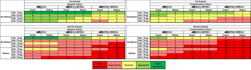 Results: Seven variables affecting stent decision-making were identified. Of the 144 scenarios, 26 (18%) were appropriate, 88 (61%) inappropriate, and 30 (21%) uncertain for stent omission. Most scenarios appropriate for omission were pre-stented (81%). Scenarios with ureteral access sheath or stones >10mm were only appropriate if pre-stented. Stenting rates of 5,181 URS cases correlated with AC scores. Stents were placed in 61% of cases appropriate for omission (practice range, 25% to 98%).