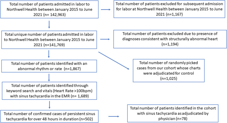 Methods: A case control study was conducted using chart review of women admitted in labor to one of 7 hospitals of Northwell Health between January 2015 to June 2021. After excluding women with structurally abnormal hearts, we identified patients with persistent ST during the peripartum period, defined as a heart rate of more than 100 bpm for more than 48 h. A control group was created by randomly subsampling those who did not meet the inclusion criteria for sinus tachycardia. Obstetric outcomes were measured as mother's length of stay (LOS), pre-term labor (PTL), admission to the neonatal ICU (NICU), and whether she received cesarean-section (CS).