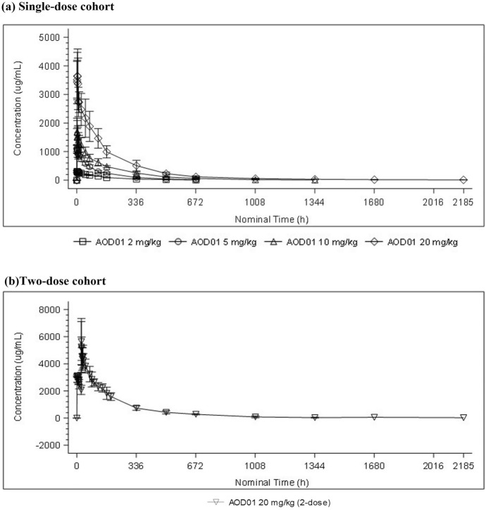Methods: Intravenous doses of AOD01 were evaluated in escalating cohorts [four single-dose cohorts (2, 5, 10, and 20 mg/kg) and one two-dose cohort (two doses of 20 mg/kg, 24 h apart)].