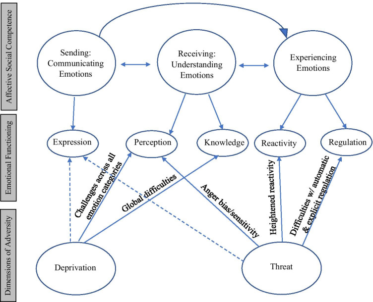 Exposure to early adversity has been linked to variations in emotional functioning. To date, however, the precise nature of these variations has been difficult to pinpoint given widespread differences in the ways in which aspects of emotional functioning are defined and measured. Here, more consistent with models of emotional functioning in typically developing populations (e.g., Halberstadt et al., 2001), we propose defining emotional functioning as consisting of distinct domains of emotion expression, perception, knowledge, reactivity, and regulation. We argue that this framework is useful for guiding hypothesis generation about the specific impact of early adversity on children's emotional functioning. We operationalize the construct of emotional functioning, highlight what is currently known about the association between adversity exposure and each domain of emotional functioning, propose potential mechanisms for these associations, and set the stage for future research examining the development of emotional functioning in the context of early adversity.