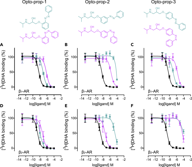 In this study, we synthesized and evaluated new photoswitchable ligands for the beta-adrenergic receptors β1-AR and β2-AR, applying an azologization strategy to the first-generation beta-blocker propranolol. The resulting compounds (Opto-prop-1, -2, -3) have good photochemical properties with high levels of light-induced trans-cis isomerization (>94%) and good thermal stability (t 1/2 > 10 days) of the resulting cis-isomer in an aqueous buffer. Upon illumination with 360-nm light to PSS cis , large differences in binding affinities were observed for photoswitchable compounds at β1-AR as well as β2-AR. Notably, Opto-prop-2 (VUF17062) showed one of the largest optical shifts in binding affinities at the β2-AR (587-fold, cis-active), as recorded so far for photoswitches of G protein-coupled receptors. We finally show the broad utility of Opto-prop-2 as a light-dependent competitive antagonist of the β2-AR as shown with a conformational β2-AR sensor, by the recruitment of downstream effector proteins and functional modulation of isolated adult rat cardiomyocytes.