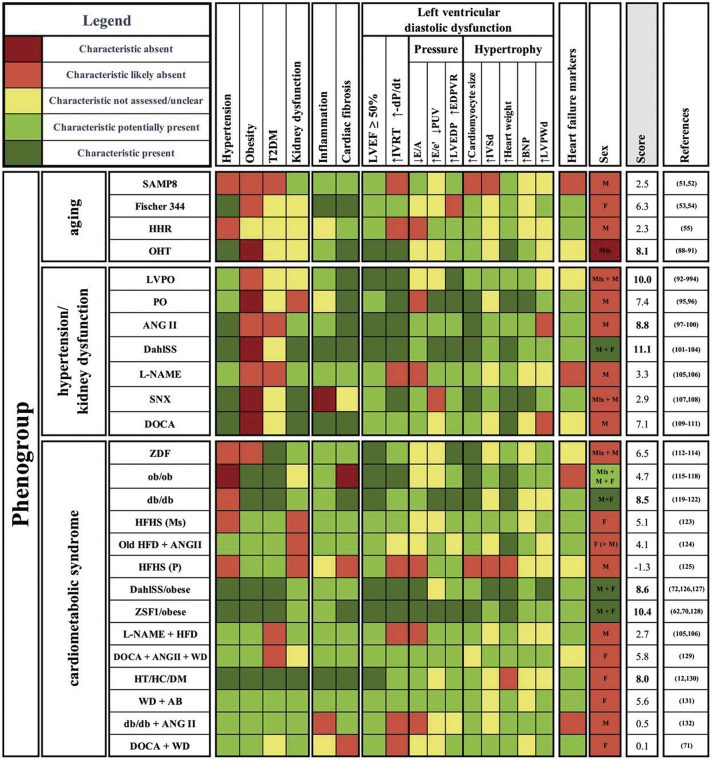 Keywords: ANGII, angiotensin II; BNP, brain natriuretic peptide; DOCA, deoxycorticosterone acetate; DahlSS, Dahl salt sensitive; HF, heart failure; HFD, high-fat diet; HFHS, high fat, high sugar; HFpEF; HFpEF, heart failure with preserved ejection fraction; HHR, hypertrophic heart rat; IVRT, isovolumetric relaxation time; L-NAME, Nω-nitrol-arginine methyl ester; LV, left ventricle/ventricular; LVDD; LVDD, left ventricular diastolic dysfunction; LVEDP, left ventricular end-diastolic pressure; LVEF, left ventricular ejection fraction; PO, pressure overload; T2DM, type 2 diabetes mellitus; ZSF1, Zucker fatty and spontaneously hypertensive; animal models; heart failure with preserved ejection fraction; left ventricular diastolic dysfunction; phenogroups.