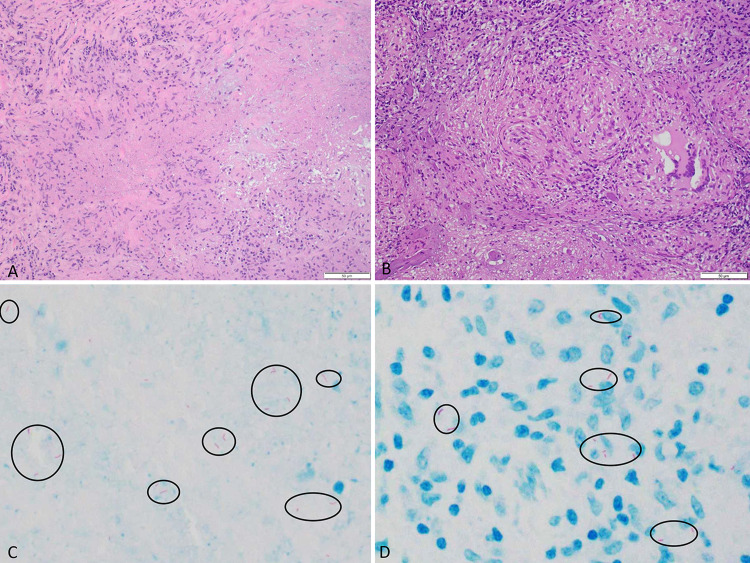 Observations: Laboratory tests were unremarkable and within normal limits. QuantiFERON testing was negative, ruling out latent TB infection. The patient received a suboccipital craniotomy, and resection of the cerebellar lesion showed caseating granuloma formation, which was positive for acid-fast bacilli and Fite stain.