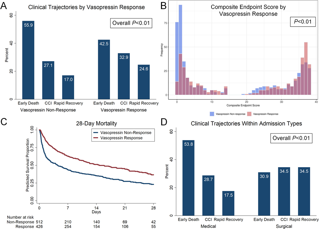 Results: In total 938 patients were included; 426 (45.4%) were vasopressin responders. The most frequent trajectory was ED (49.8%), 29.7% developed CCI, and 20.5% had rapid recovery. In survivors to ICU day 14 (those without ED), 59.2% had CCI and 40.8% experienced RR. Compared with vasopressin non-responders, vasopressin responders less frequently experienced ED (42.5% vs. 55.9%) and more frequently experienced RR (24.6% vs. 17.0%; P < 0.01). After controlling for confounders, vasopressin response was independently associated with higher odds of developing a better clinical trajectory (OR 1.63; 95% CI 1.26-2.10). Medical patients most frequently developed ED and survivors more commonly developed CCI than RR; surgical patients developed the three trajectories with similar frequency (P < 0.01).